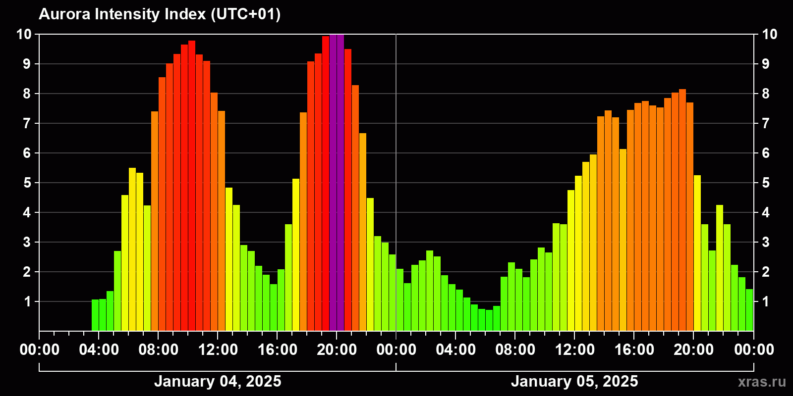 Changes in the auroral intensity index from 2025-01-04 to 2025-01-05 local time