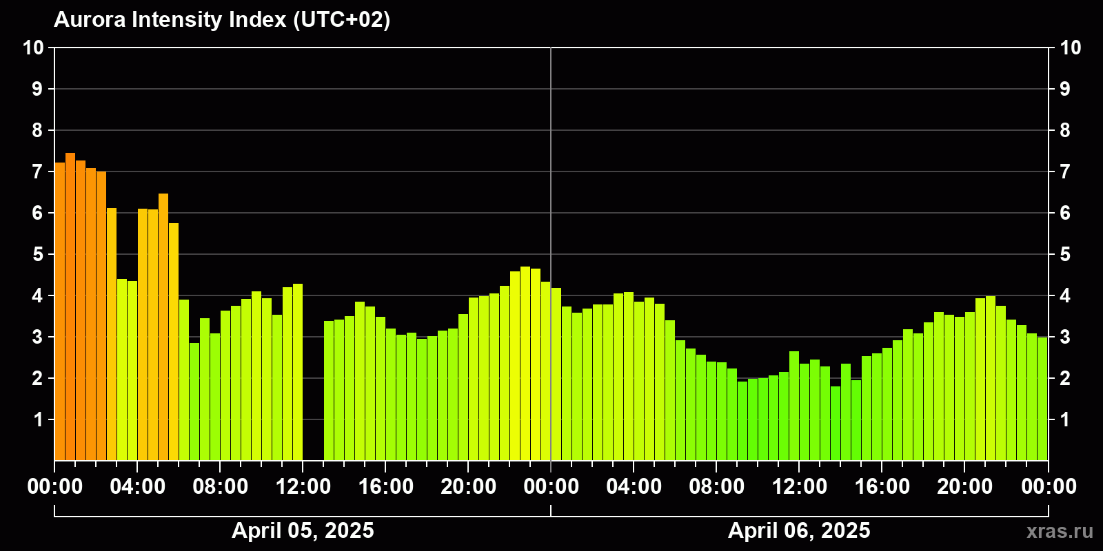 Changes in the auroral intensity index from 2025-04-05 to 2025-04-06 local time