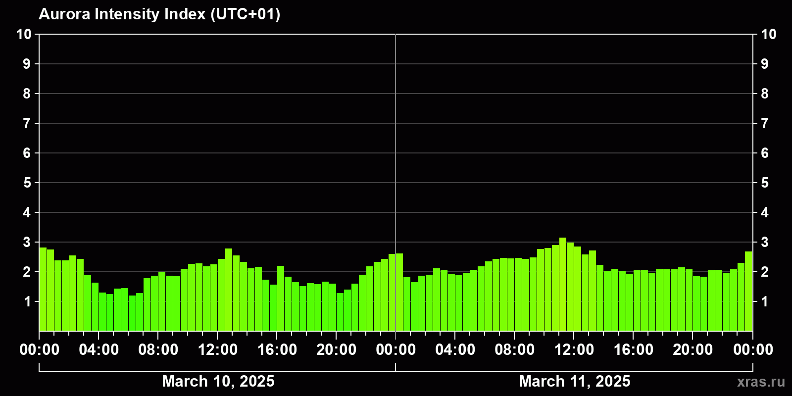 Auroral intensity index and the theoretically possible latitude of observations for nighttime in the Estern Hemisphere as of 2025-03-11 23:54 (end of day) local time