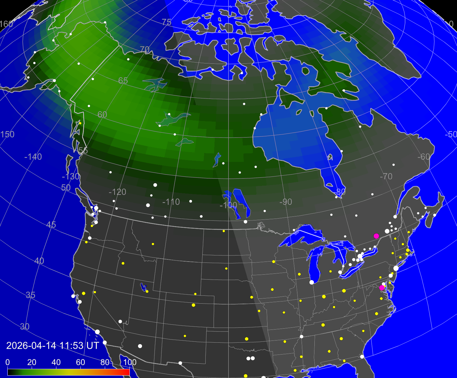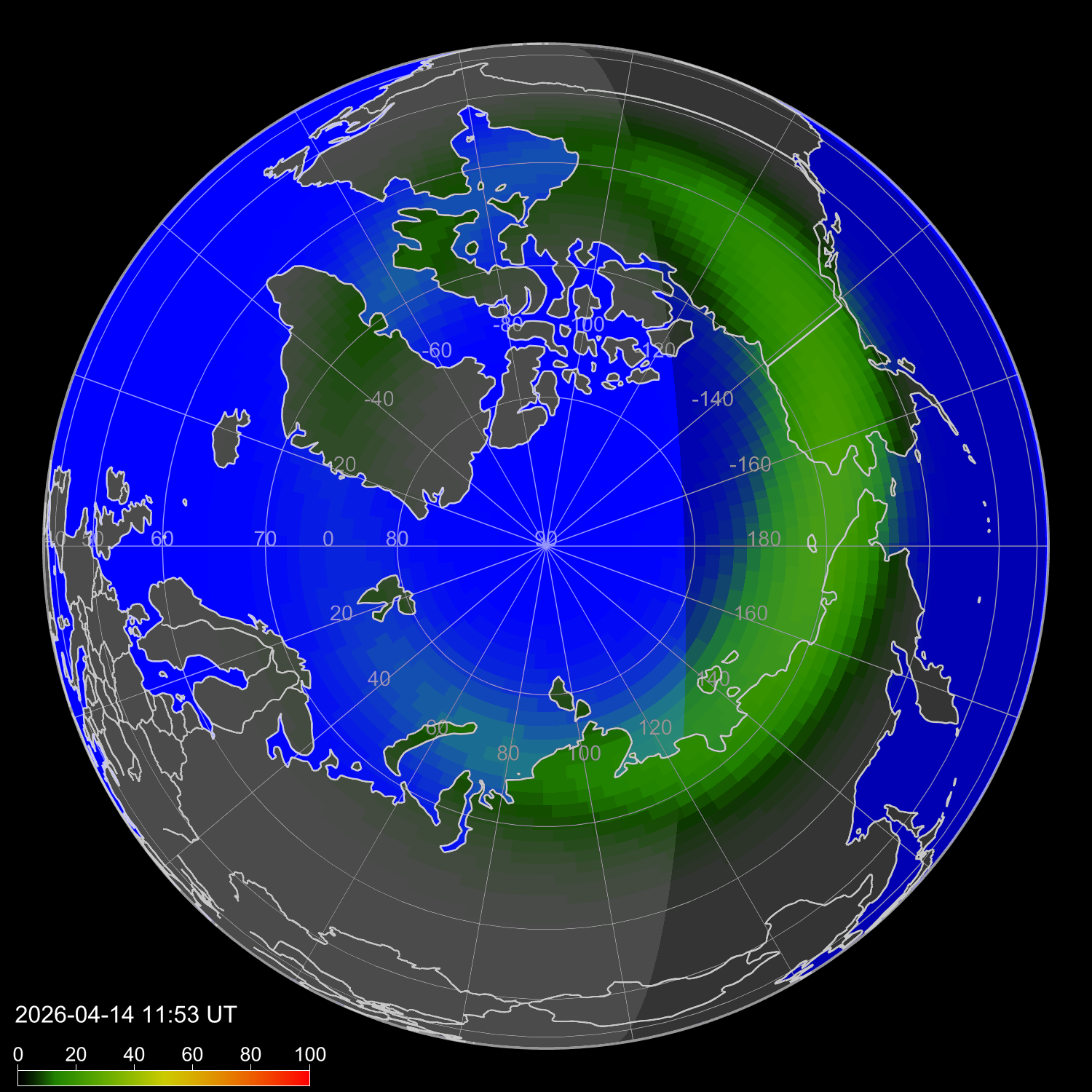 Changes and hourly forecast of the auroral intensity index from 2026-04-13 to 2026-04-14