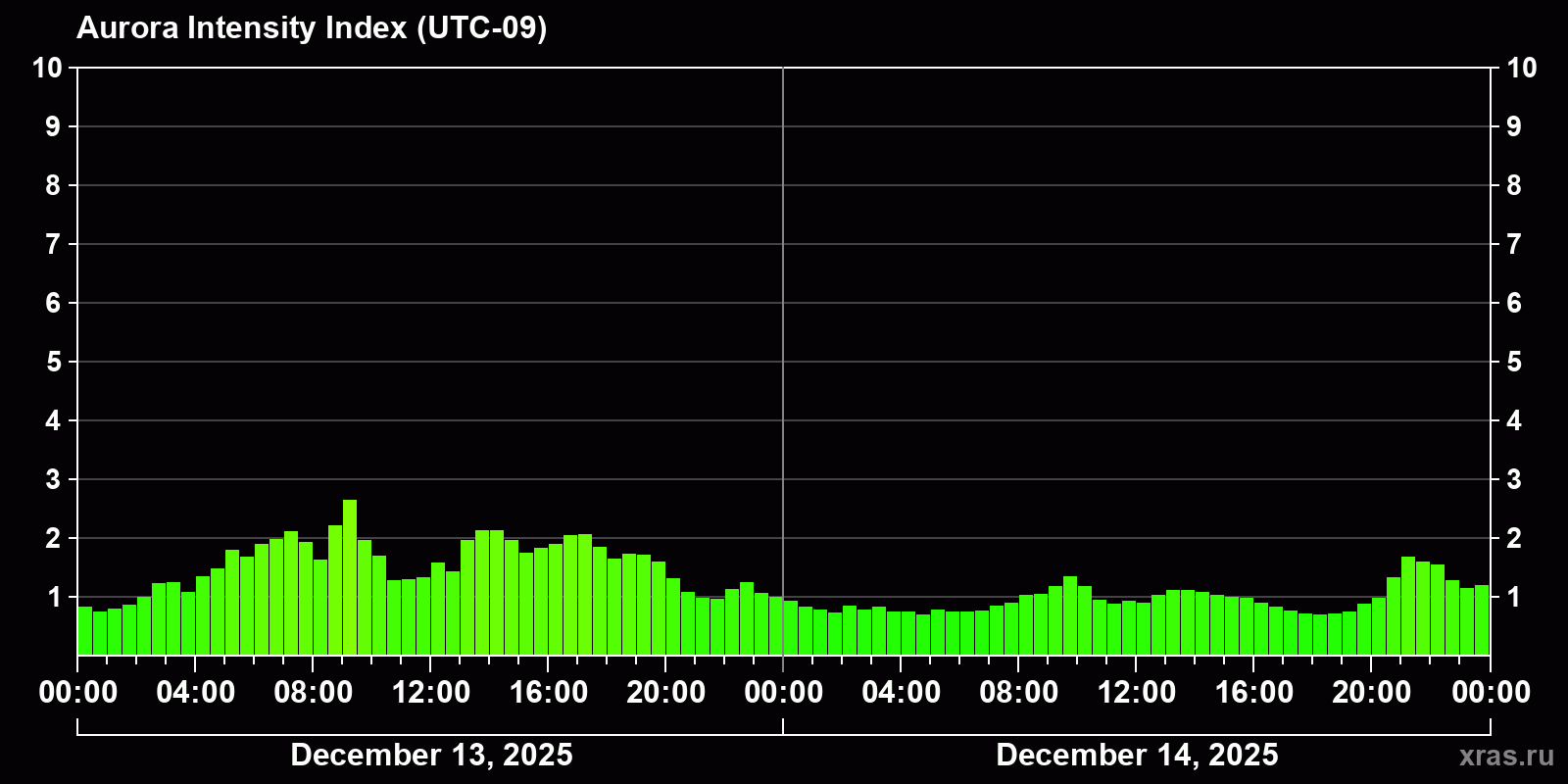 Changes in the auroral intensity index from 2025-12-13 to 2025-12-14 local time