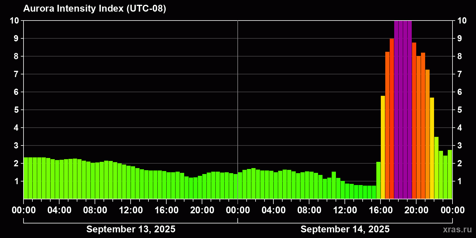 Changes in the auroral intensity index from 2025-09-13 to 2025-09-14 local time
