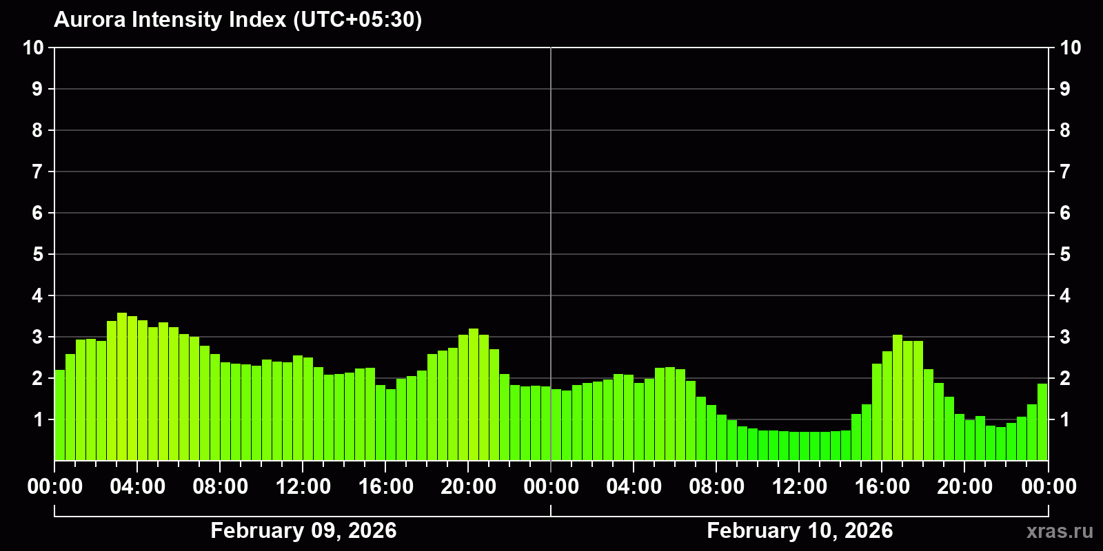 Auroral intensity index and the theoretically possible latitude of observations for nighttime in the Estern Hemisphere as of 2026-02-10 23:55 (end of day) local time