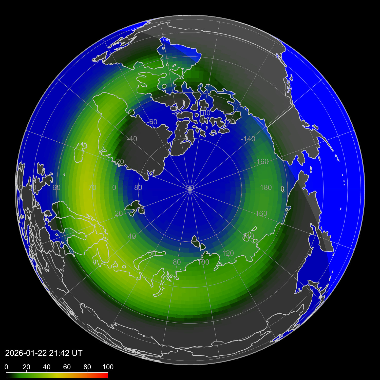 Изменения и часовой прогноз индекса интенсивности полярных сияний с 2026-01-20 по 2026-01-21