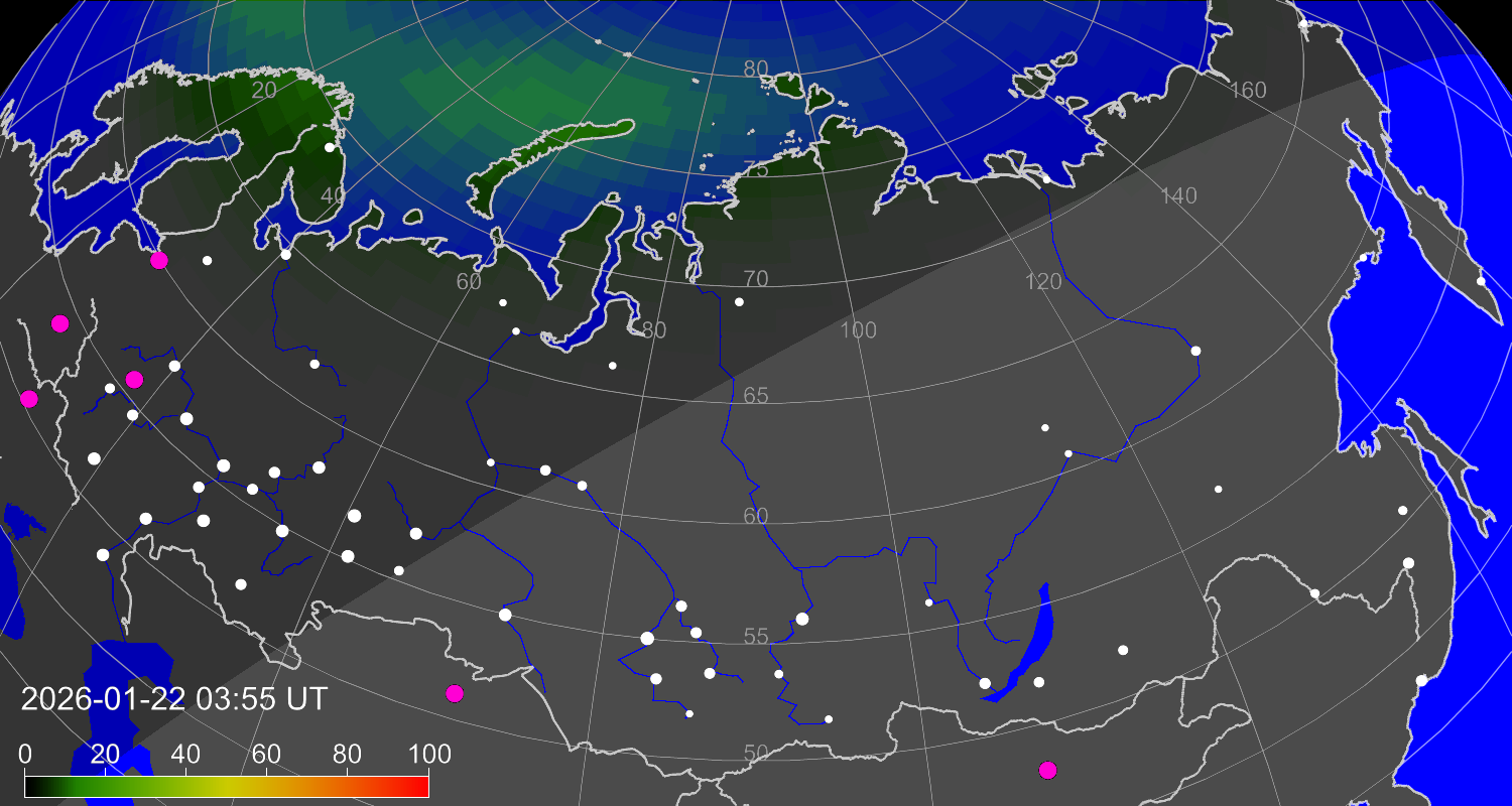 Индекс интенсивности полярных сияний и теоретически возможная широта наблюдений для ночного времени в восточном полушарии