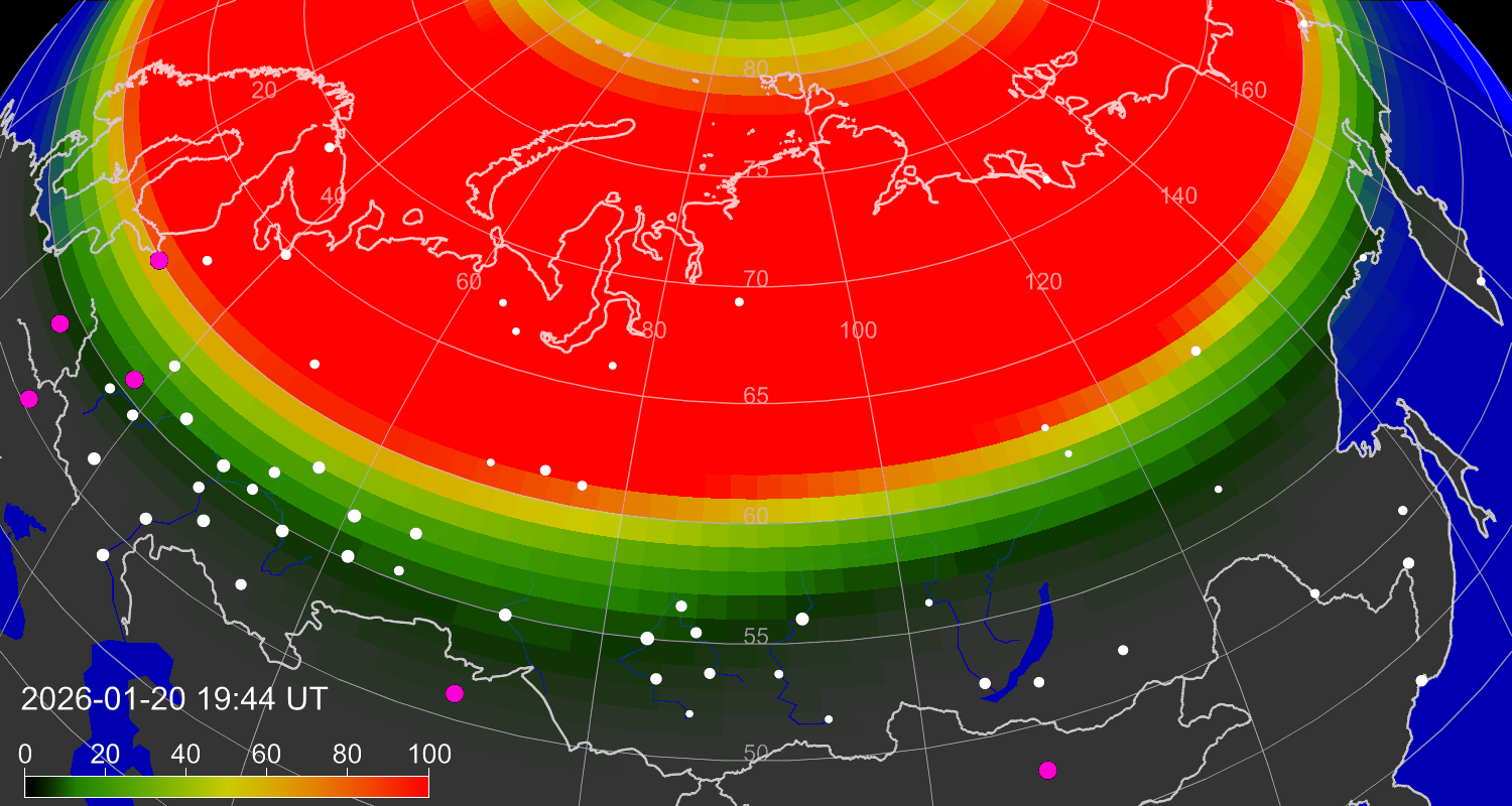 Изменения и часовой прогноз индекса интенсивности полярных сияний с 2026-01-20 по 2026-01-21