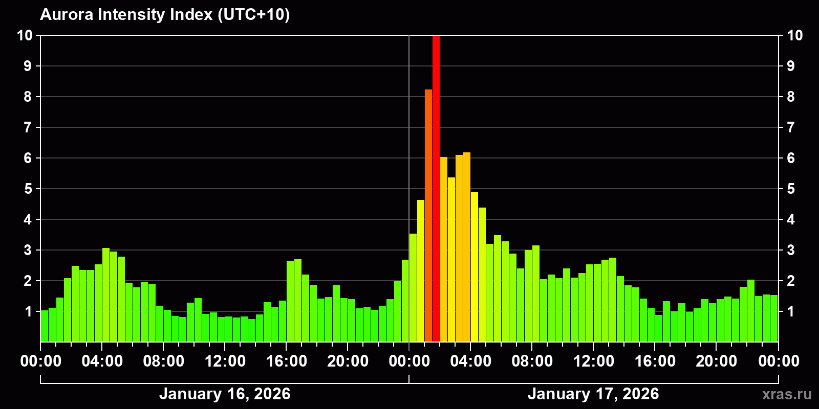 Changes in the auroral intensity index from 2026-01-16 to 2026-01-17 local time