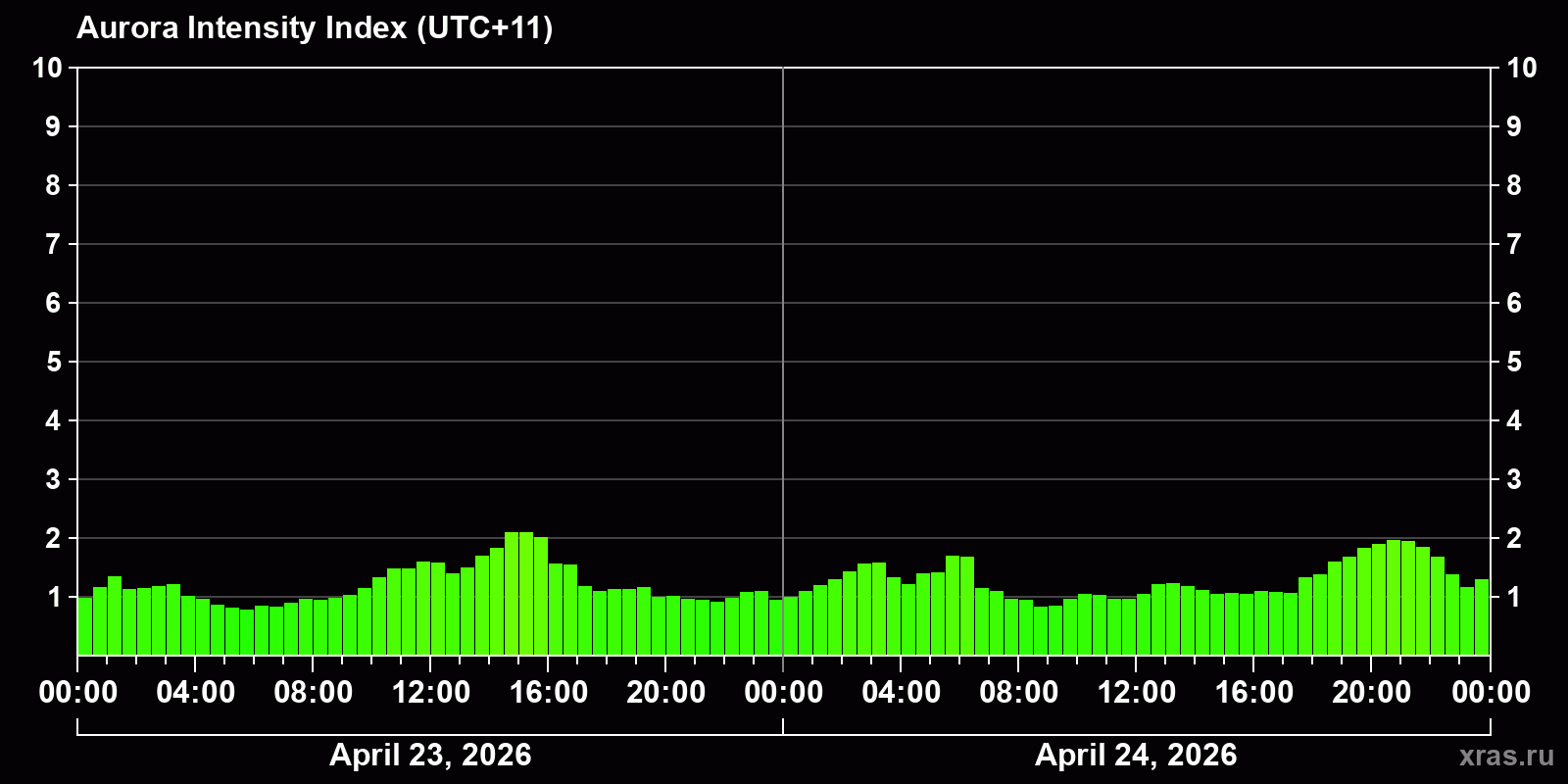 Changes in the auroral intensity index from 2026-04-23 to 2026-04-24 local time