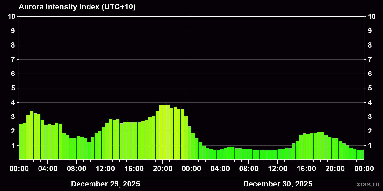 Changes in the auroral intensity index from 2025-12-29 to 2025-12-30 local time