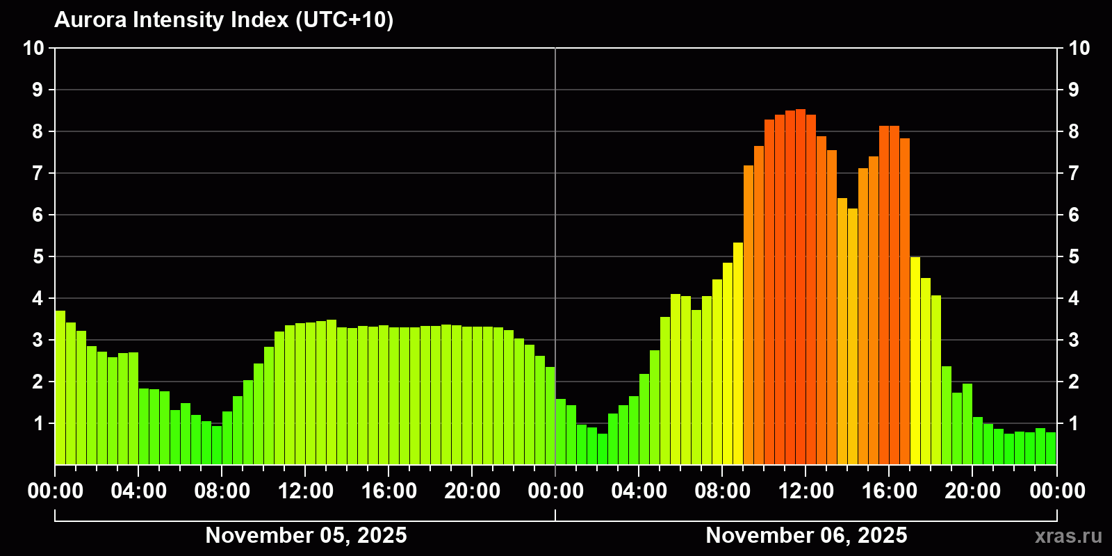 Changes in the auroral intensity index from 2025-11-05 to 2025-11-06 local time