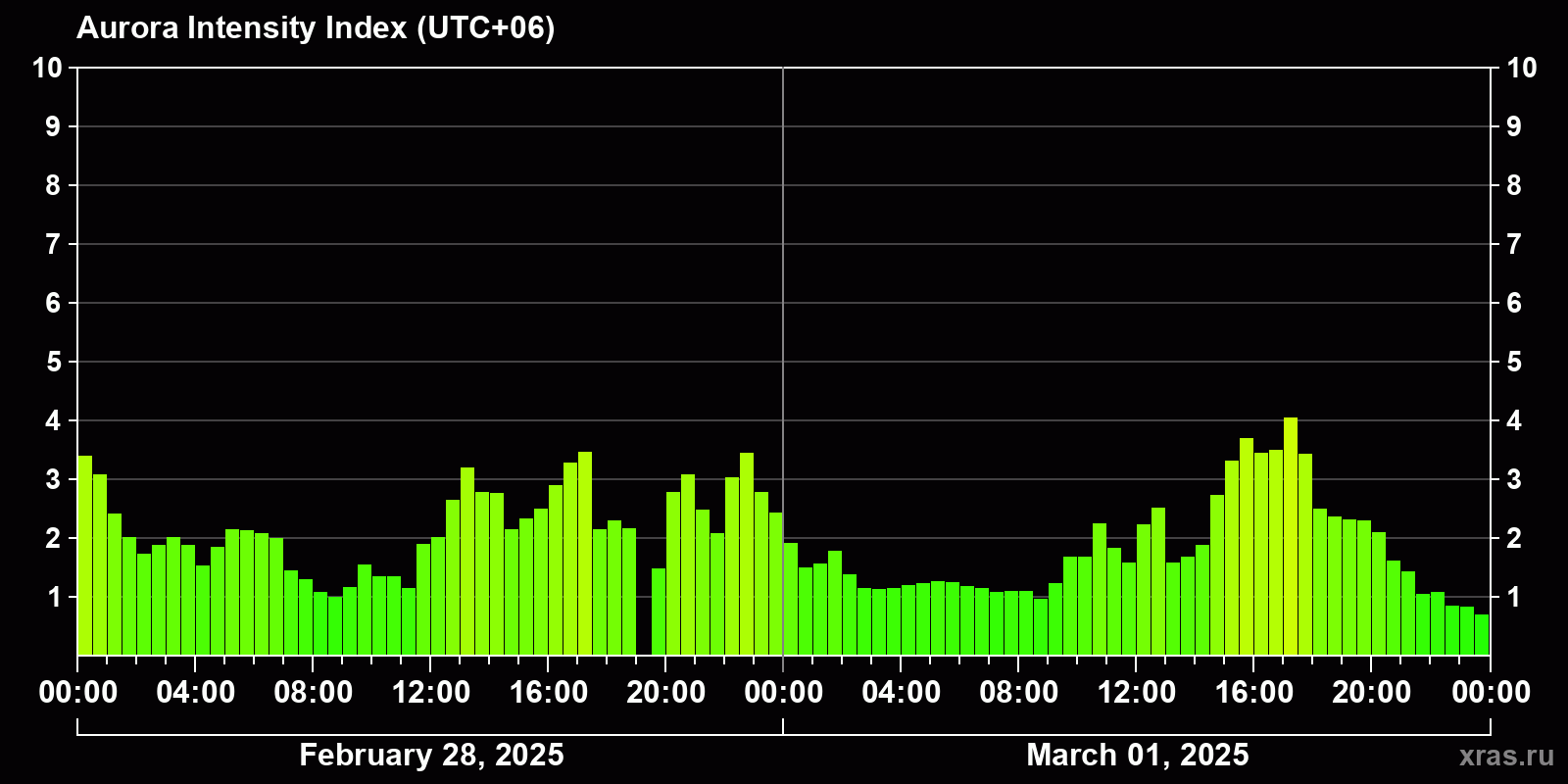 Auroral intensity index and the theoretically possible latitude of observations for nighttime in the Estern Hemisphere as of 2025-03-01 23:46 (end of day) local time