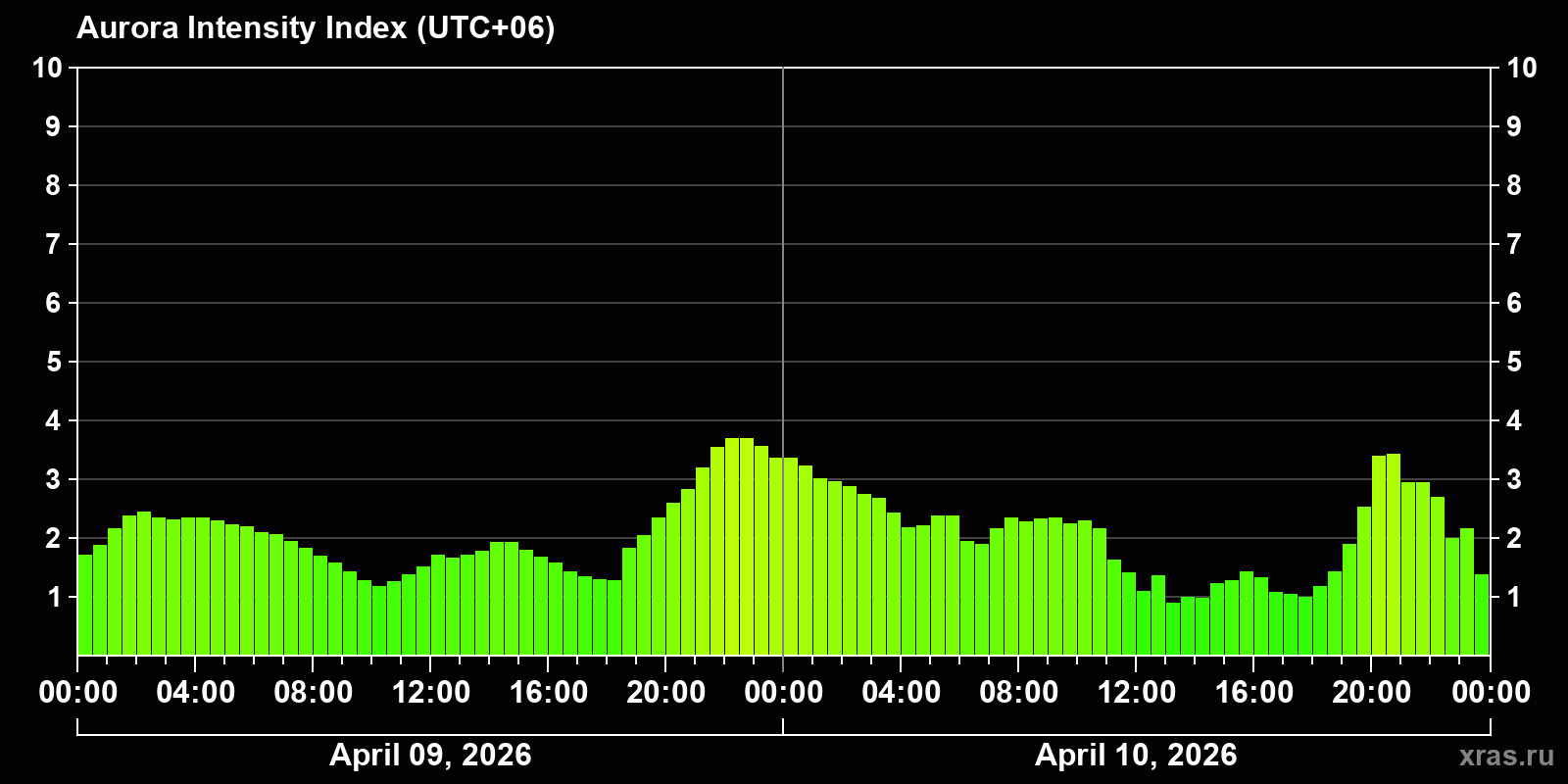 Changes in the auroral intensity index from 2026-04-09 to 2026-04-10 local time