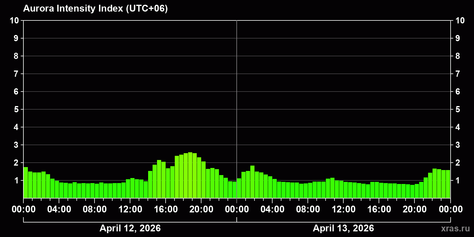 Changes in the auroral intensity index from 2026-04-12 to 2026-04-13 local time