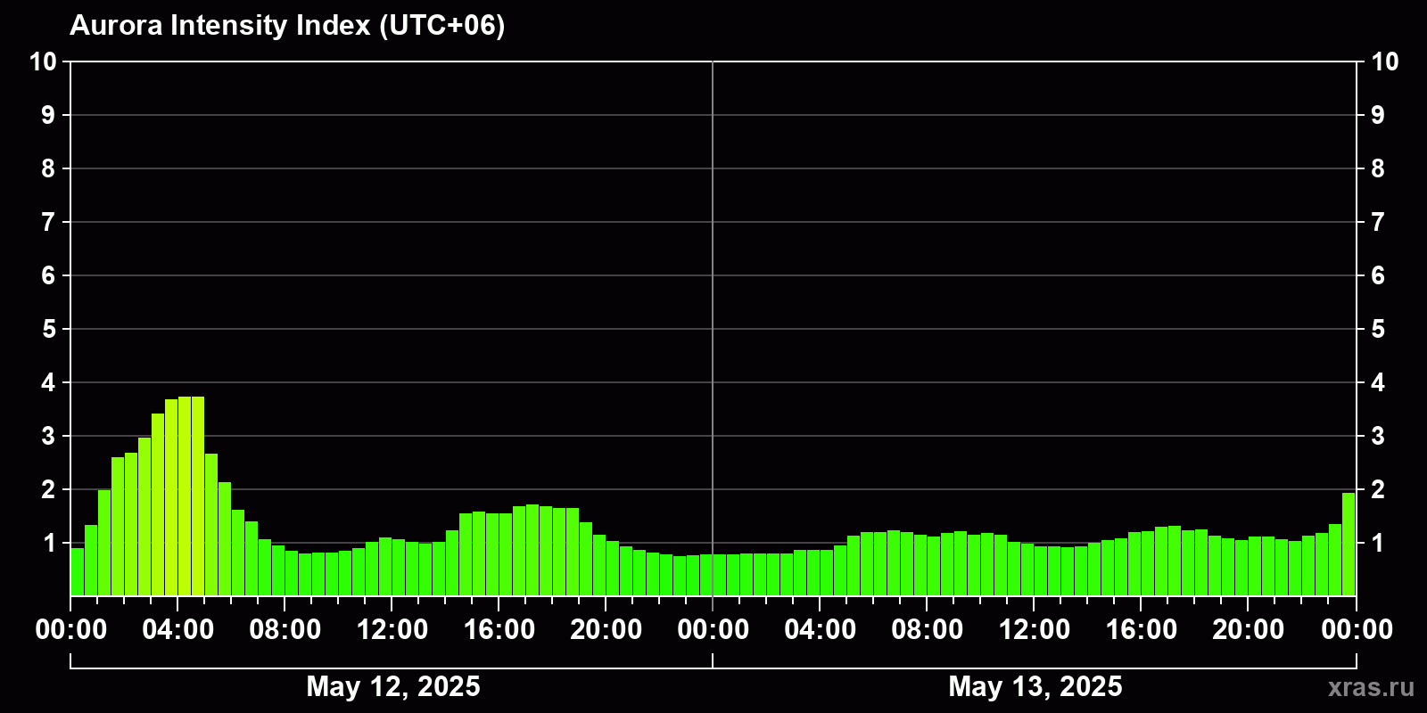 Auroral intensity index and the theoretically possible latitude of observations for nighttime in the Estern Hemisphere as of 2025-05-13 23:45 (end of day) local time