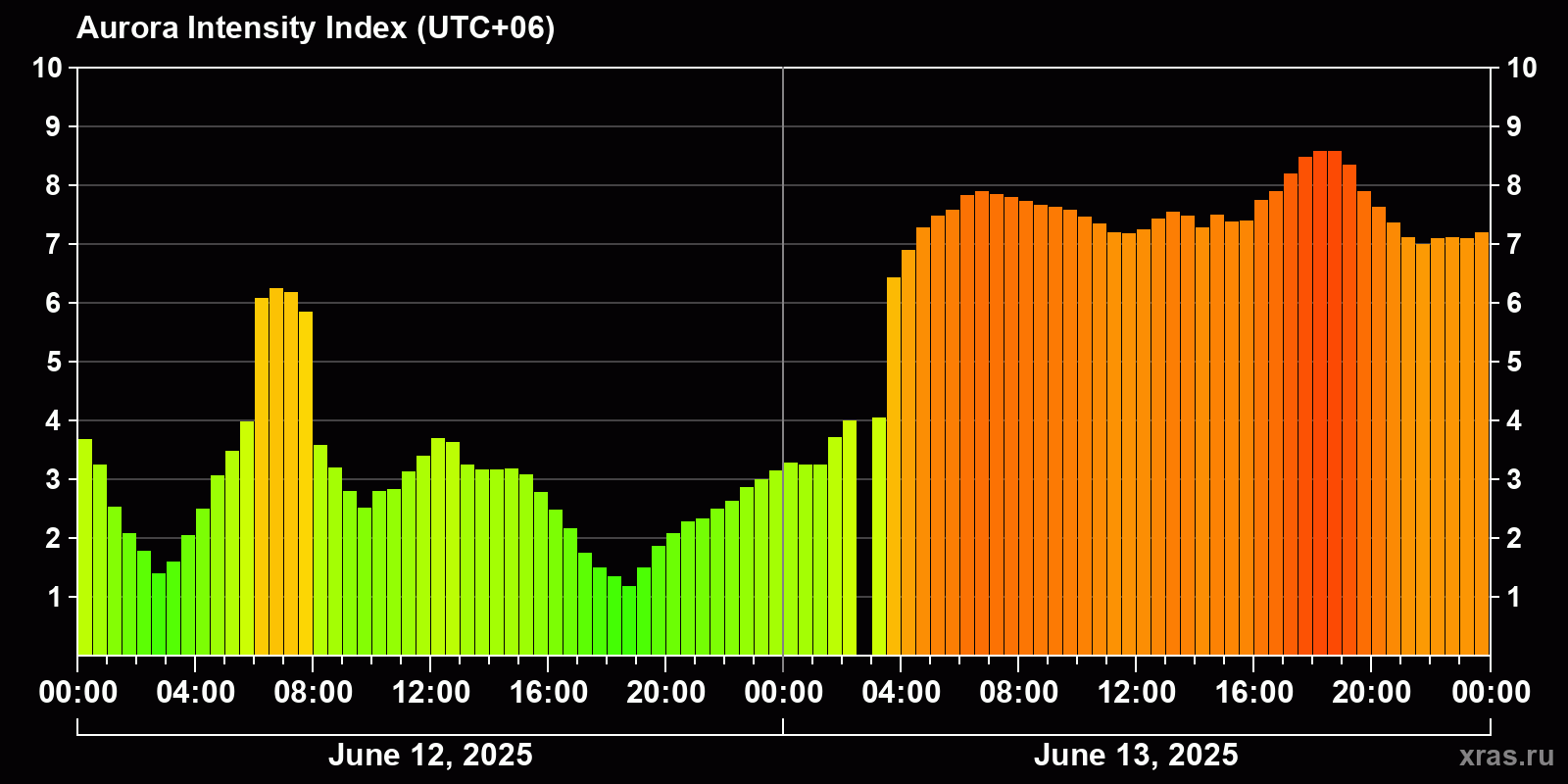 Changes in the auroral intensity index from 2025-06-12 to 2025-06-13 local time