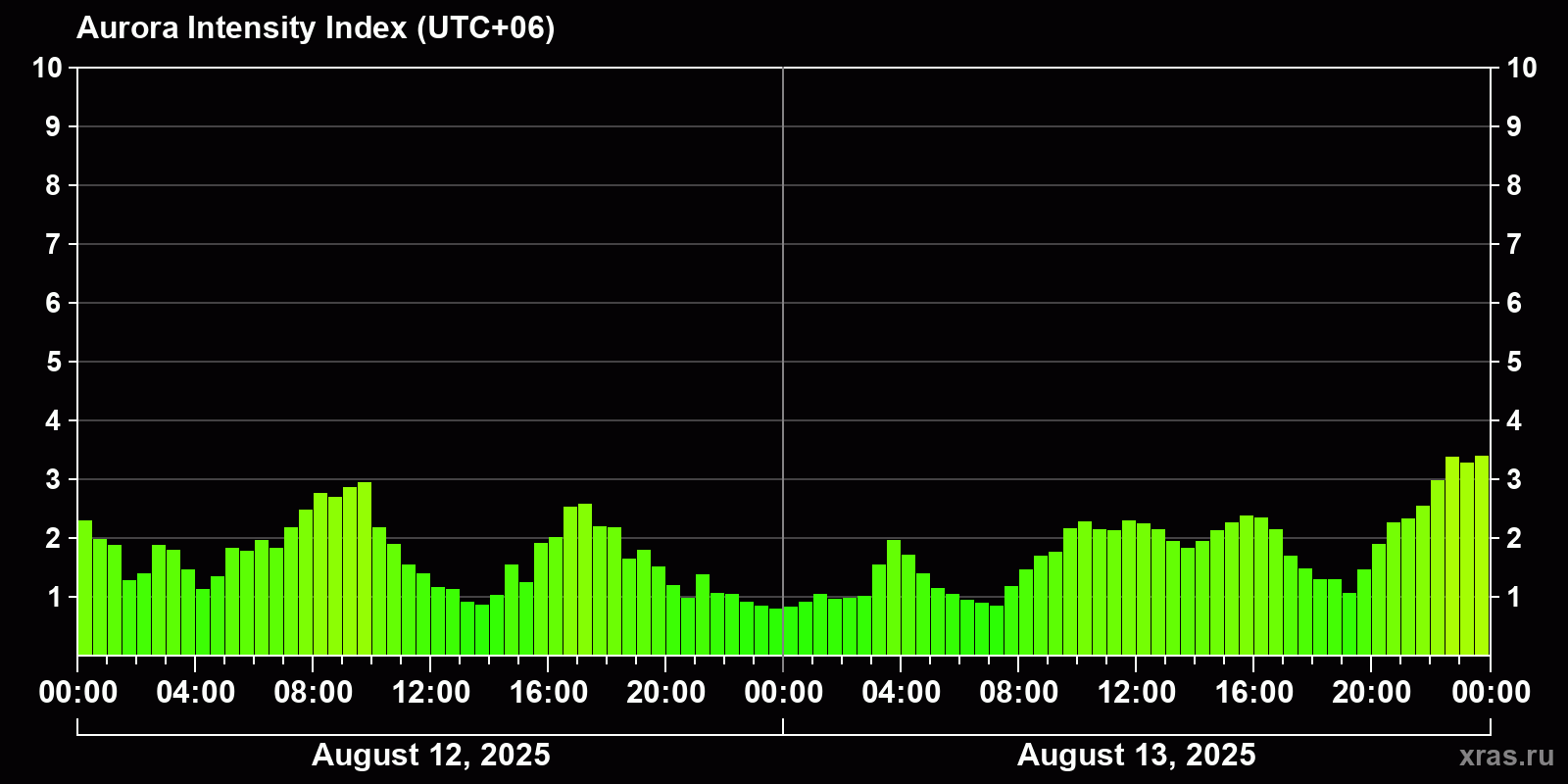 Auroral intensity index and the theoretically possible latitude of observations for nighttime in the Estern Hemisphere as of 2025-08-13 23:48 (end of day) local time