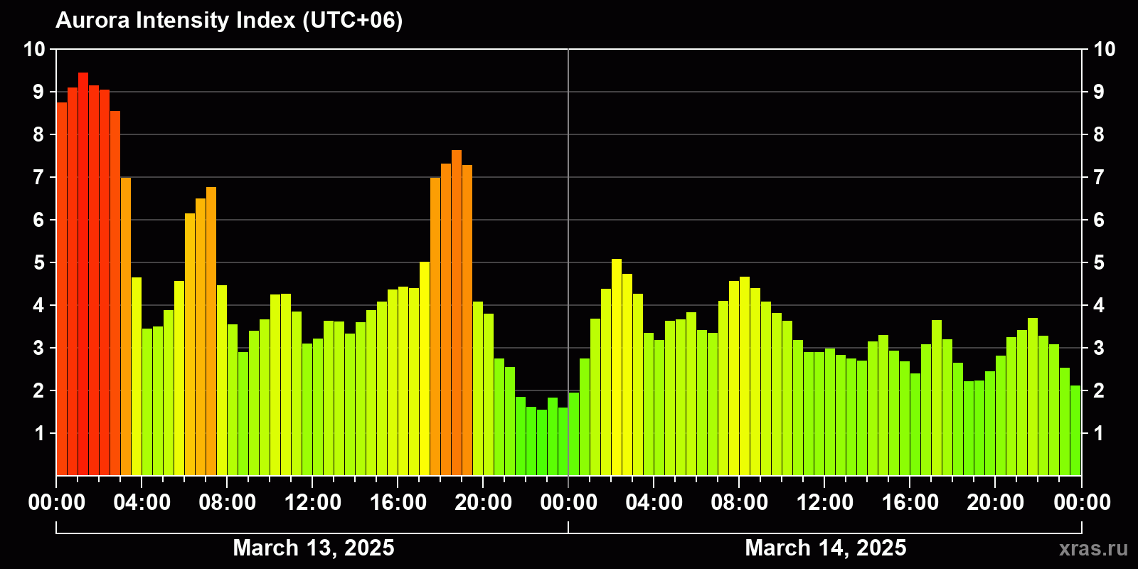 Auroral intensity index and the theoretically possible latitude of observations for nighttime in the Estern Hemisphere as of 2025-03-14 23:48 (end of day) local time
