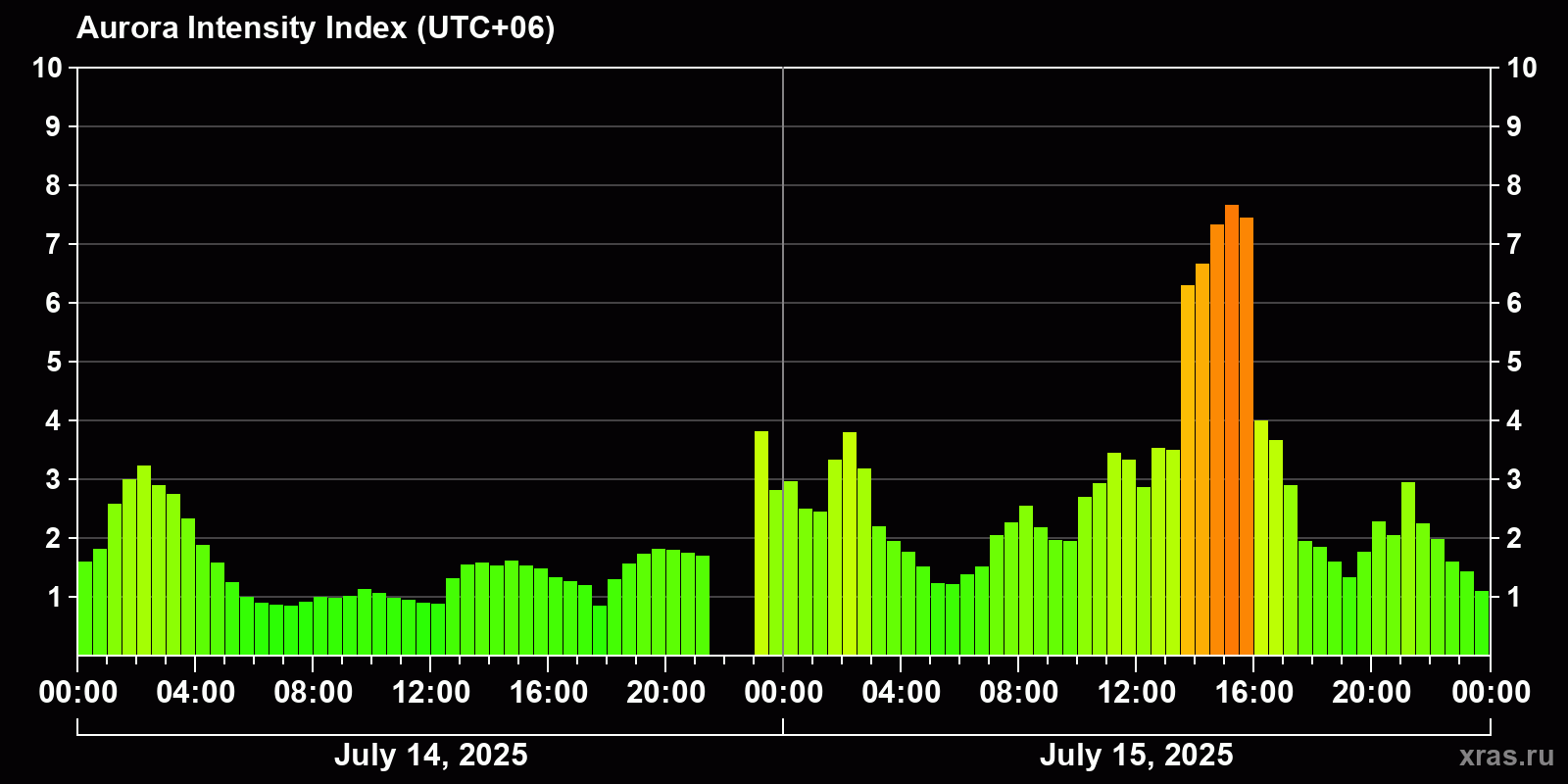 Changes in the auroral intensity index from 2025-07-14 to 2025-07-15 local time