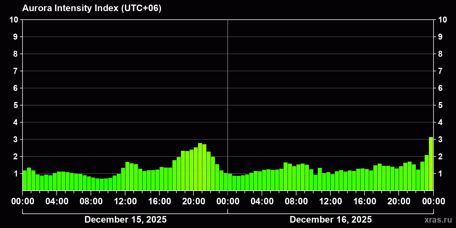 Auroral intensity index and the theoretically possible latitude of observations for nighttime in the Estern Hemisphere as of 2025-12-16 23:57 (end of day) local time