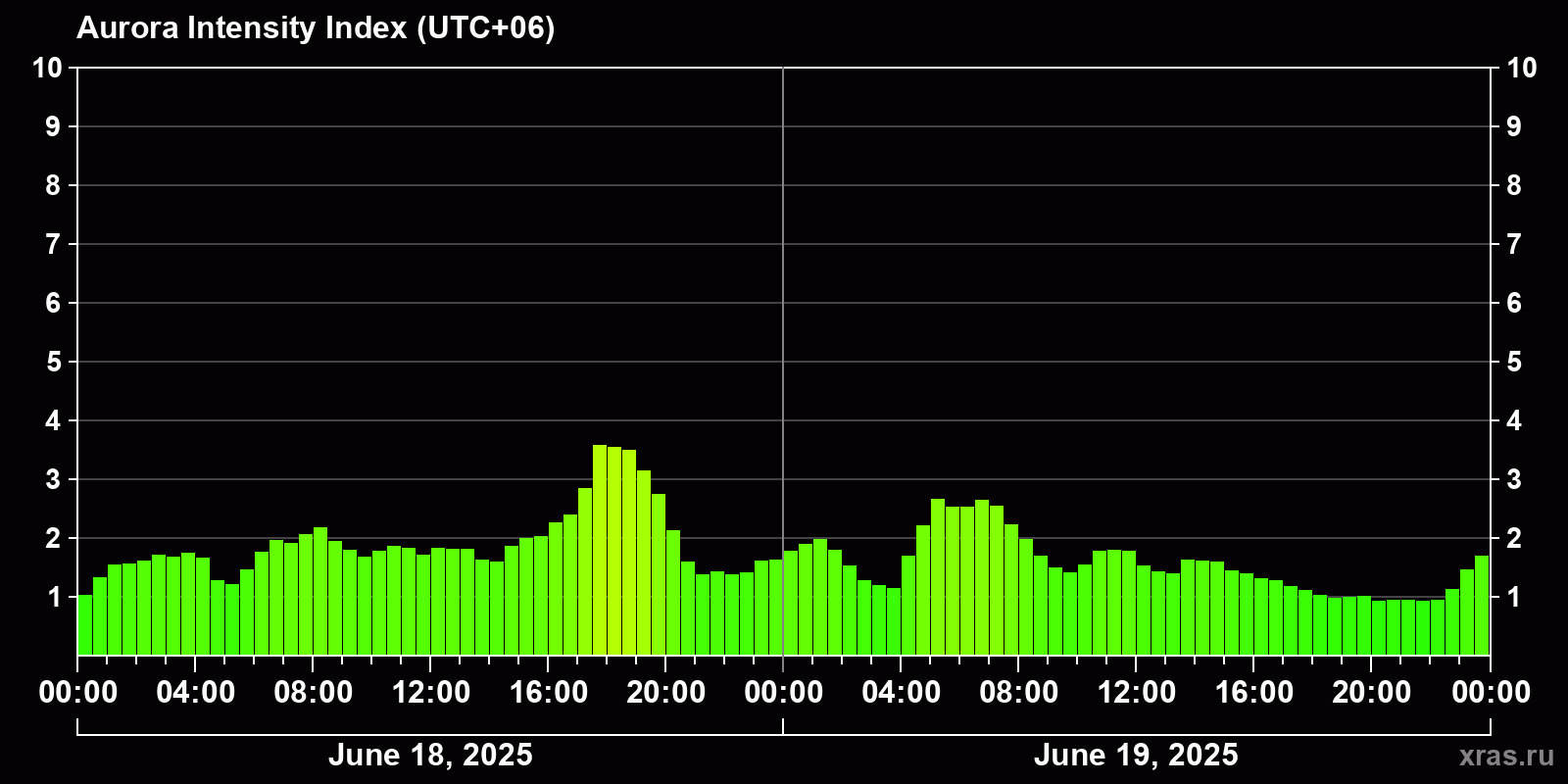 Changes in the auroral intensity index from 2025-06-18 to 2025-06-19 local time