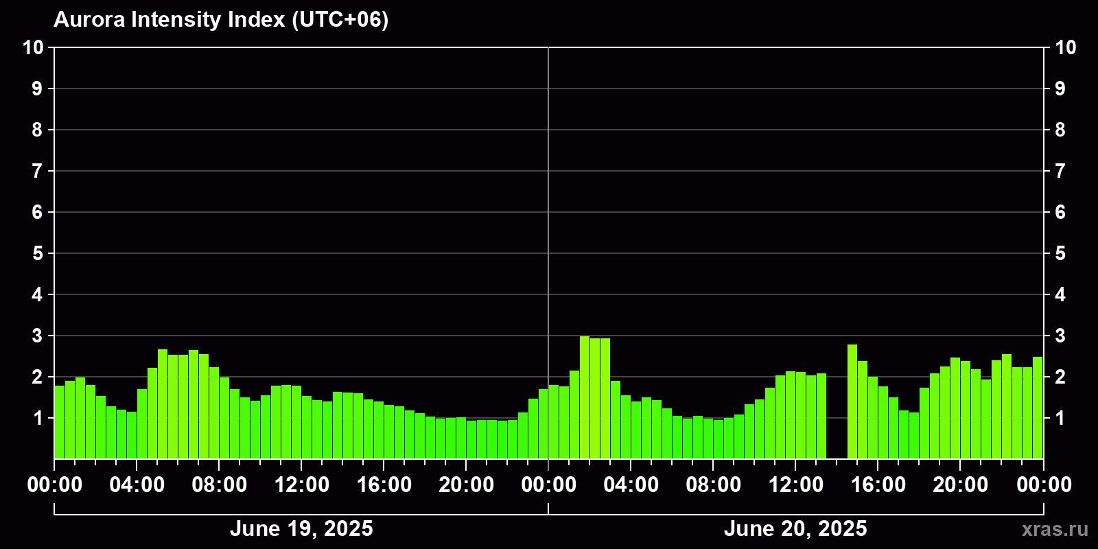 Auroral intensity index and the theoretically possible latitude of observations for nighttime in the Estern Hemisphere as of 2025-06-20 23:45 (end of day) local time