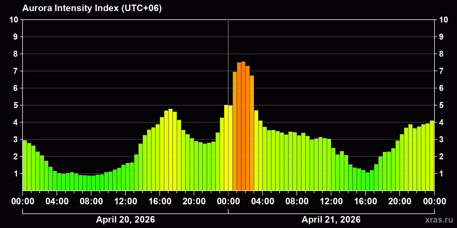 Changes in the auroral intensity index from 2026-04-20 to 2026-04-21 local time