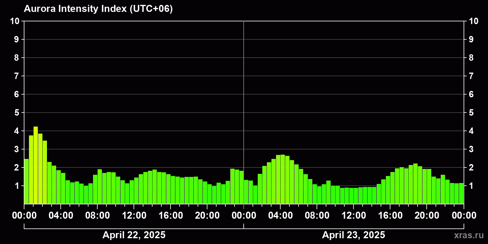 Auroral intensity index and the theoretically possible latitude of observations for nighttime in the Estern Hemisphere as of 2025-04-23 23:51 (end of day) local time