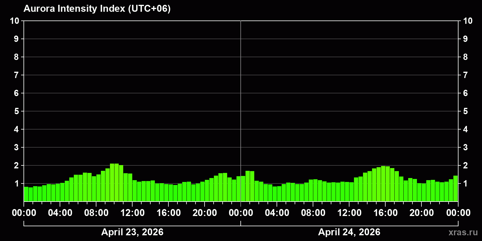 Changes in the auroral intensity index from 2026-04-23 to 2026-04-24 local time