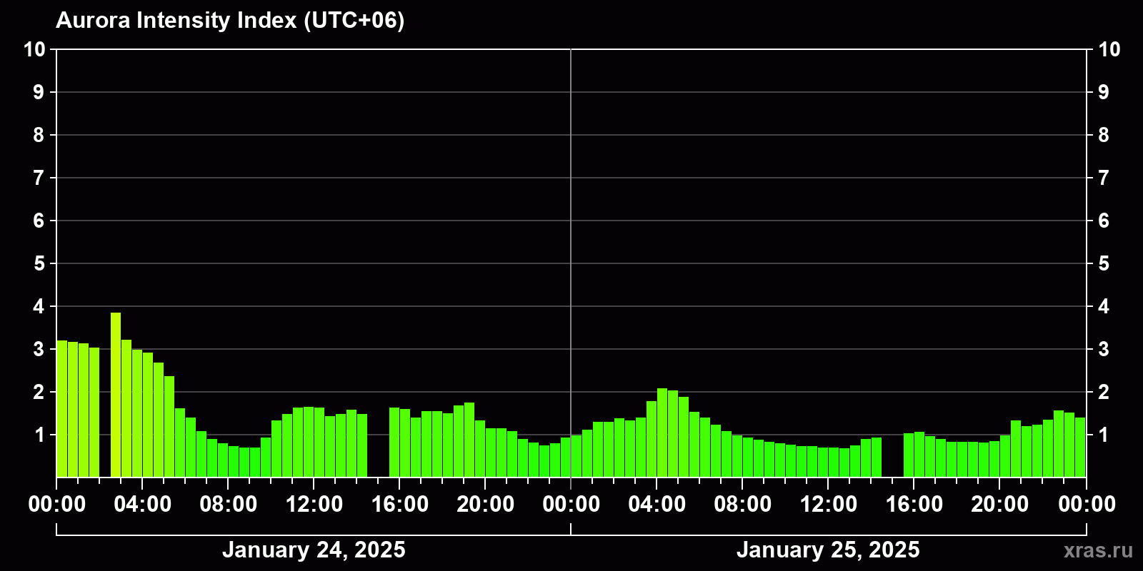 Changes in the auroral intensity index from 2025-01-24 to 2025-01-25 local time