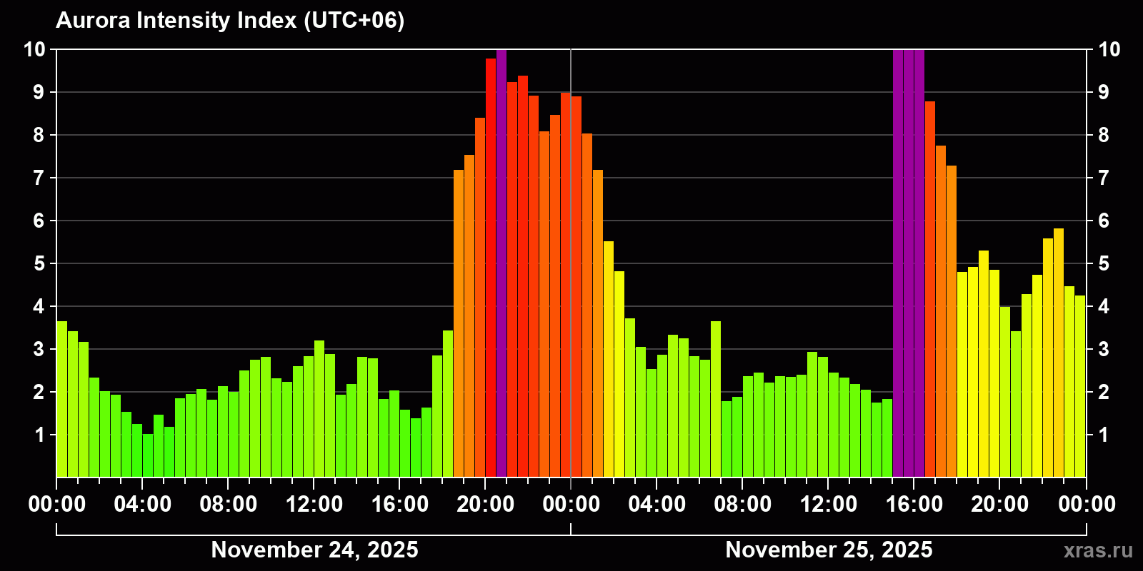 Changes in the auroral intensity index from 2025-11-24 to 2025-11-25 local time