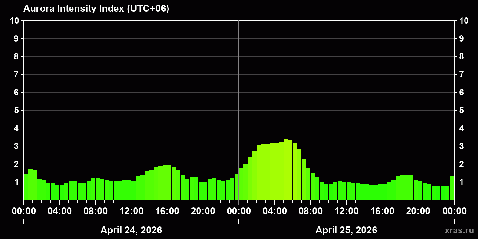Auroral intensity index and the theoretically possible latitude of observations for nighttime in the Estern Hemisphere as of 2026-04-25 23:53 (end of day) local time