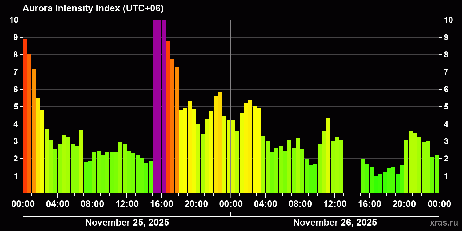 Changes in the auroral intensity index from 2025-11-25 to 2025-11-26 local time