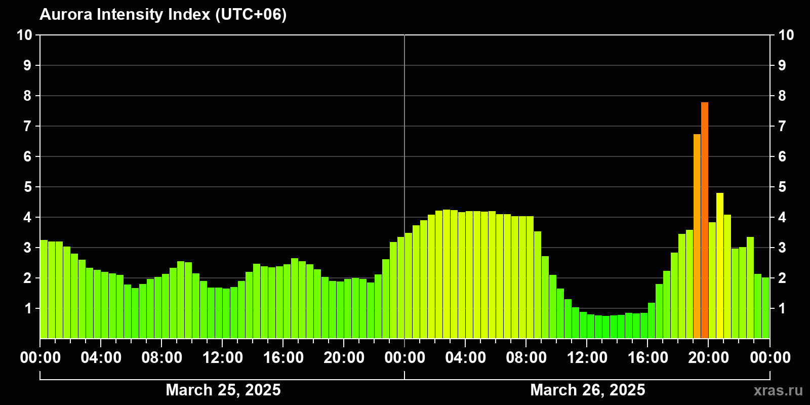 Changes in the auroral intensity index from 2025-03-25 to 2025-03-26 local time