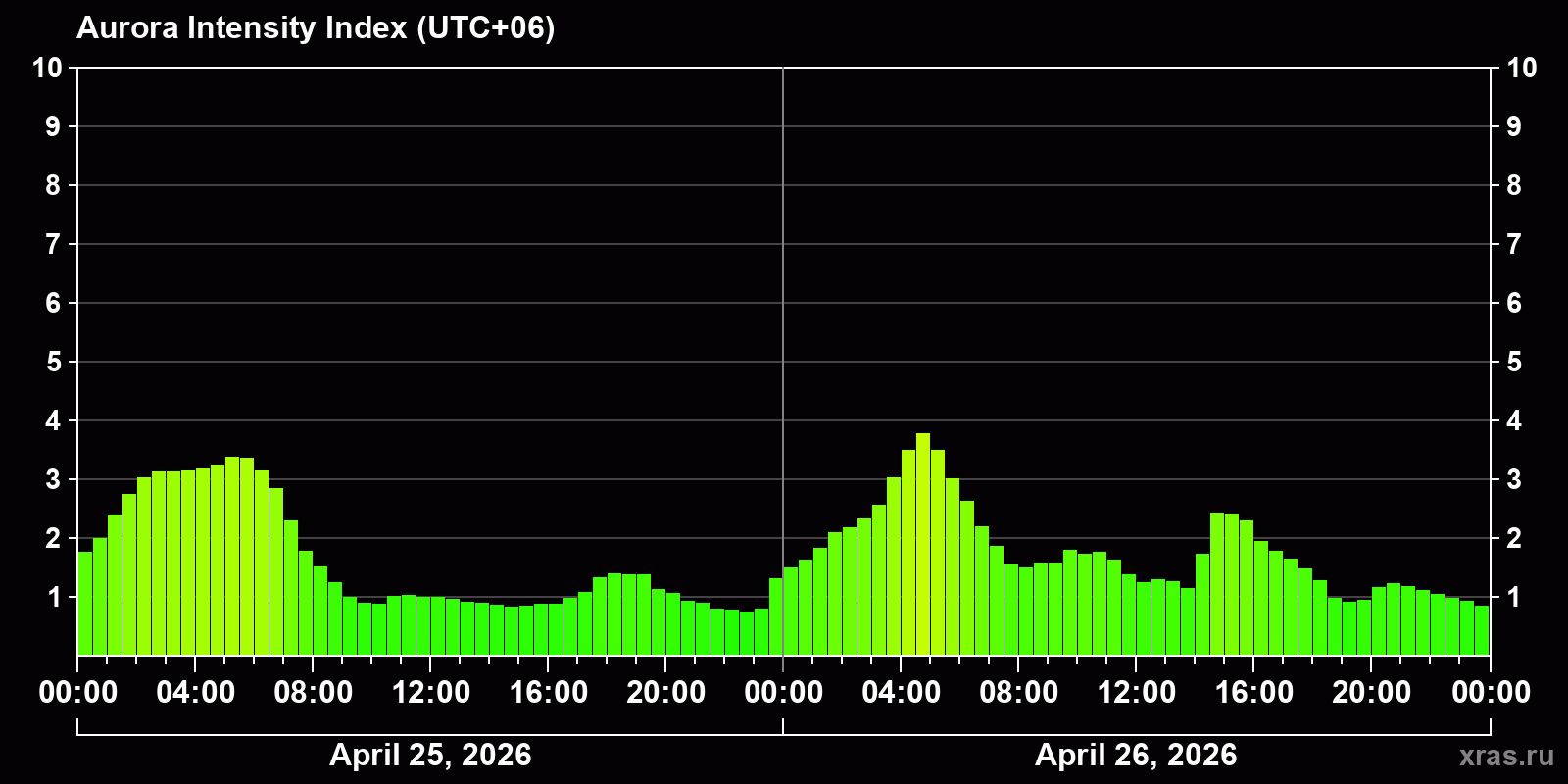 Changes in the auroral intensity index from 2026-04-25 to 2026-04-26 local time