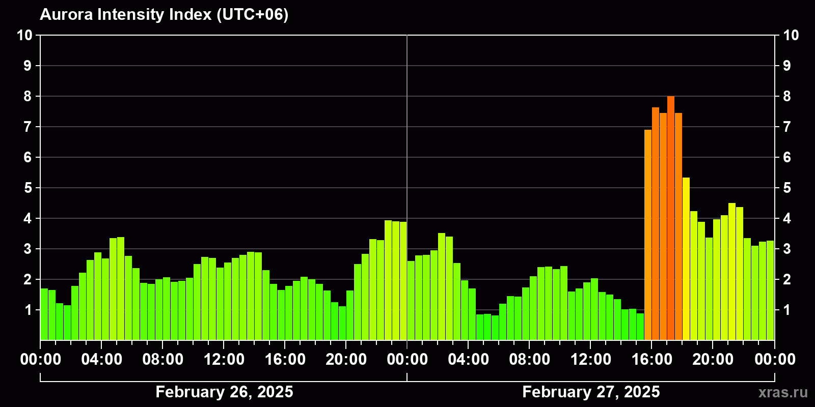 Changes in the auroral intensity index from 2025-02-26 to 2025-02-27 local time