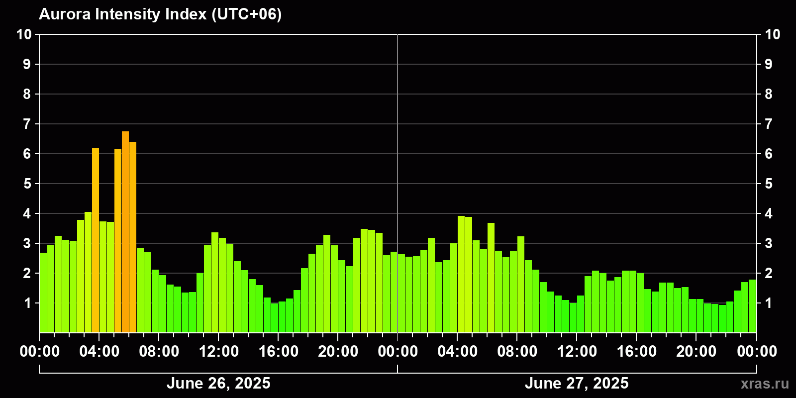 Changes in the auroral intensity index from 2025-06-26 to 2025-06-27 local time