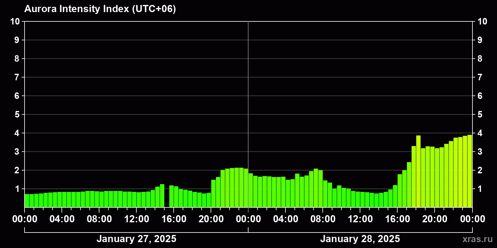 Auroral intensity index and the theoretically possible latitude of observations for nighttime in the Estern Hemisphere as of 2025-01-28 23:45 (end of day) local time