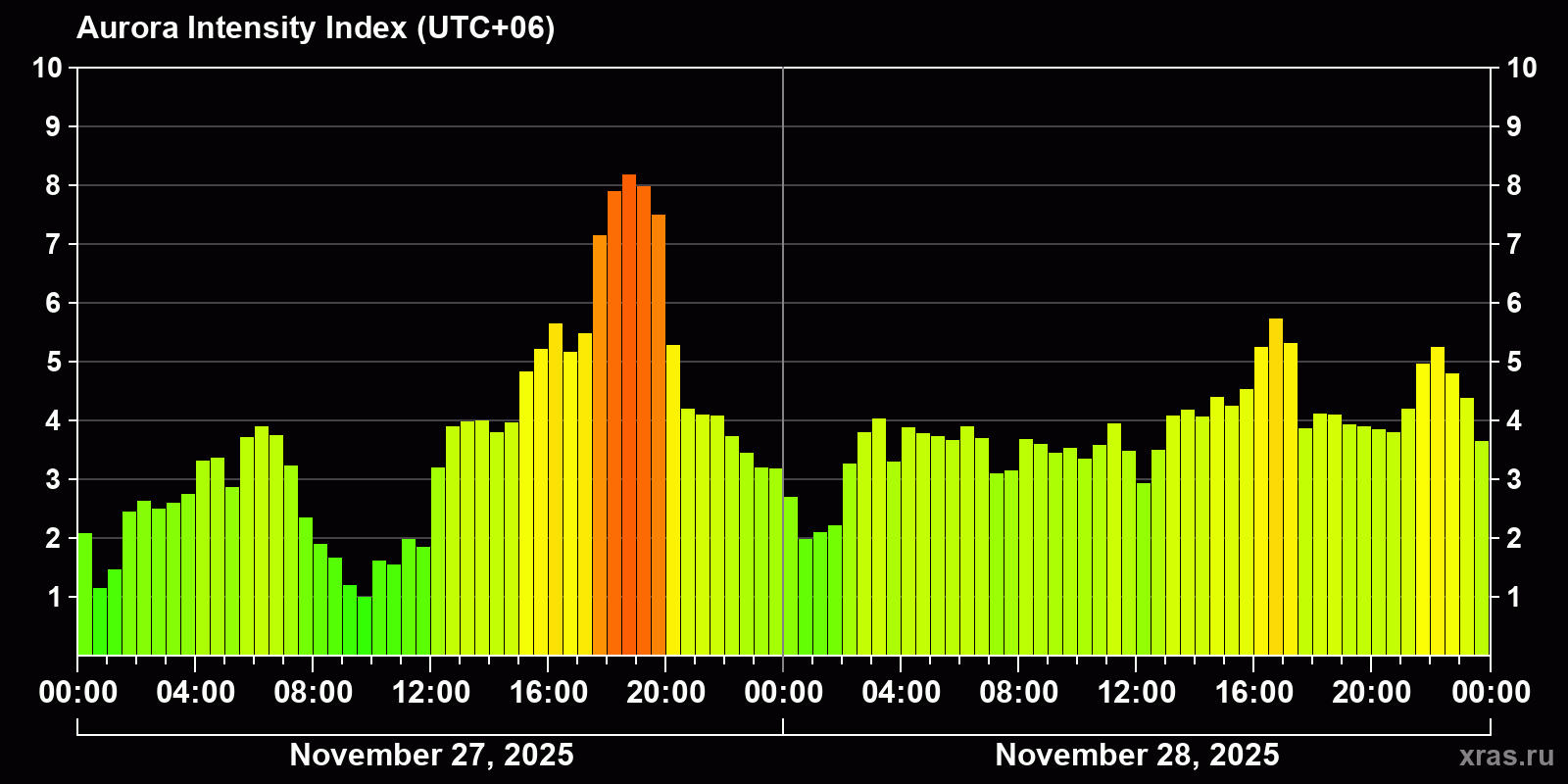 Changes in the auroral intensity index from 2025-11-27 to 2025-11-28 local time