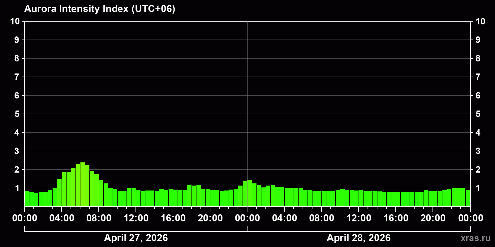 Auroral intensity index and the theoretically possible latitude of observations for nighttime in the Estern Hemisphere as of 2026-04-28 23:49 (end of day) local time