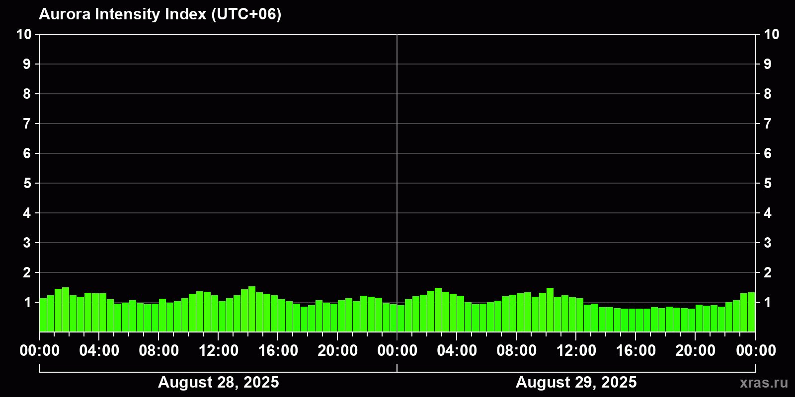 Changes in the auroral intensity index from 2025-08-28 to 2025-08-29 local time