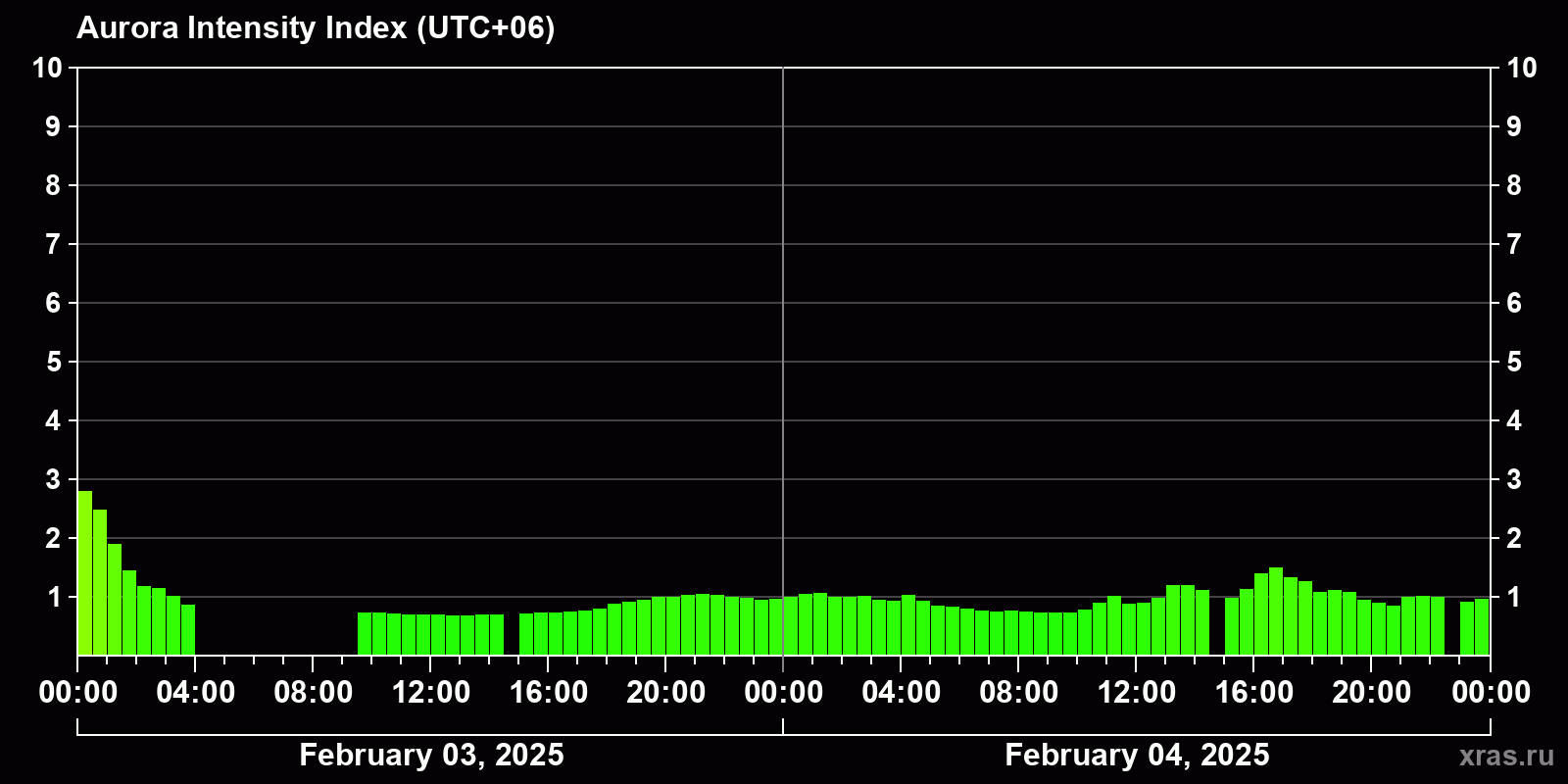 Changes in the auroral intensity index from 2025-02-03 to 2025-02-04 local time