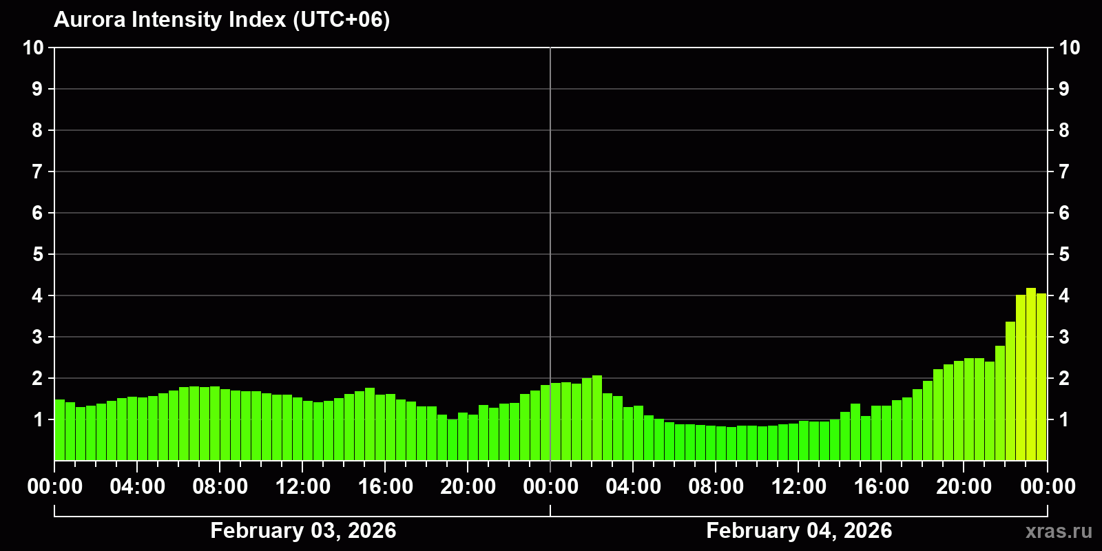 Changes in the auroral intensity index from 2026-02-03 to 2026-02-04 local time