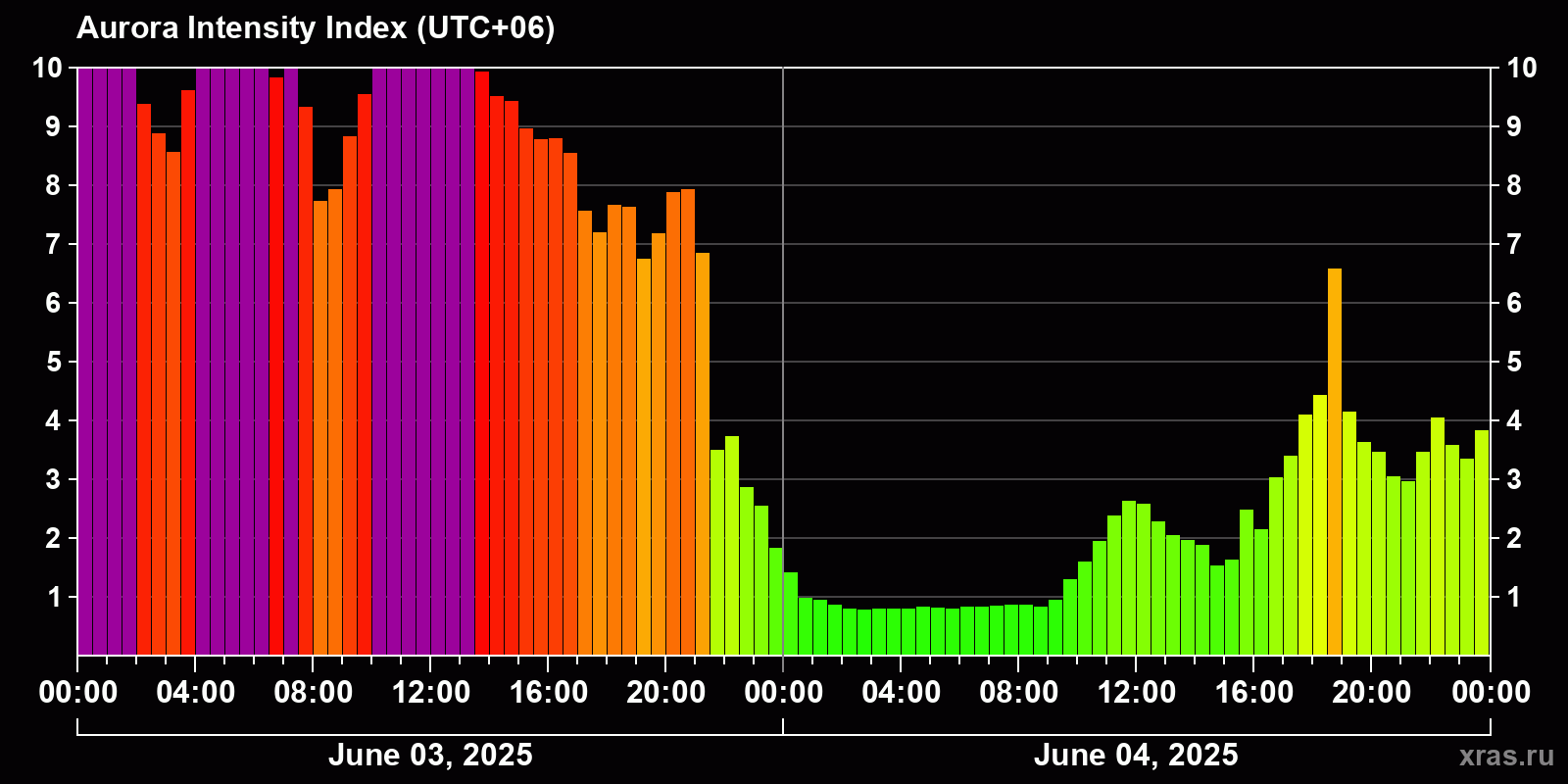 Changes in the auroral intensity index from 2025-06-03 to 2025-06-04 local time
