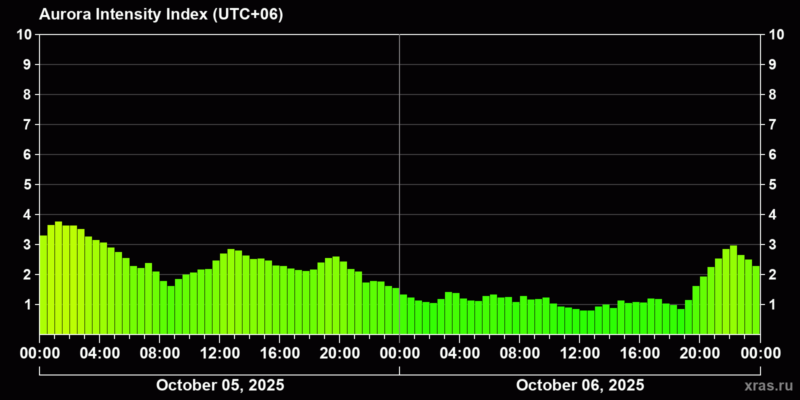 Auroral intensity index and the theoretically possible latitude of observations for nighttime in the Estern Hemisphere as of 2025-10-06 23:52 (end of day) local time