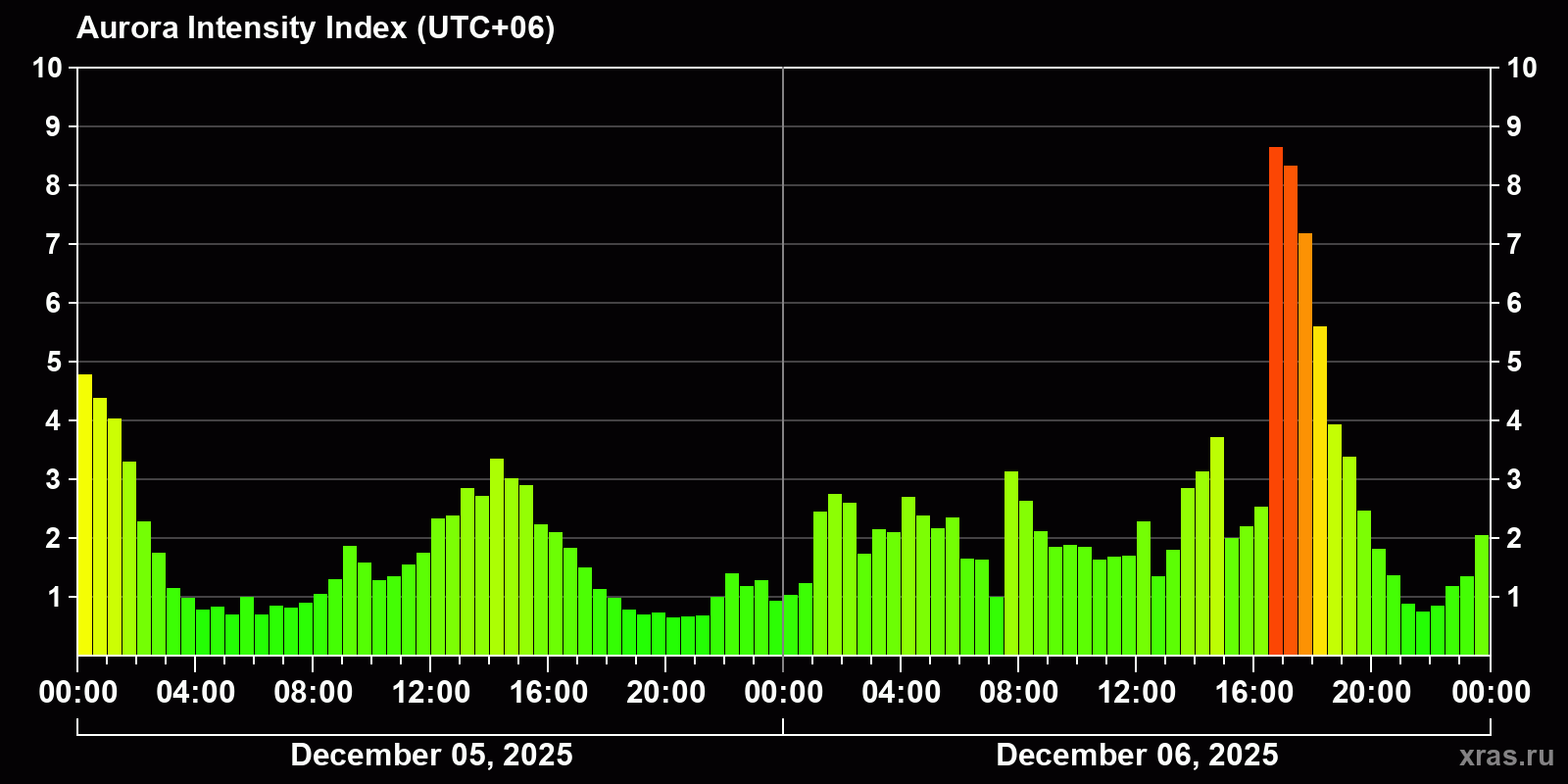 Auroral intensity index and the theoretically possible latitude of observations for nighttime in the Estern Hemisphere as of 2025-12-06 23:57 (end of day) local time