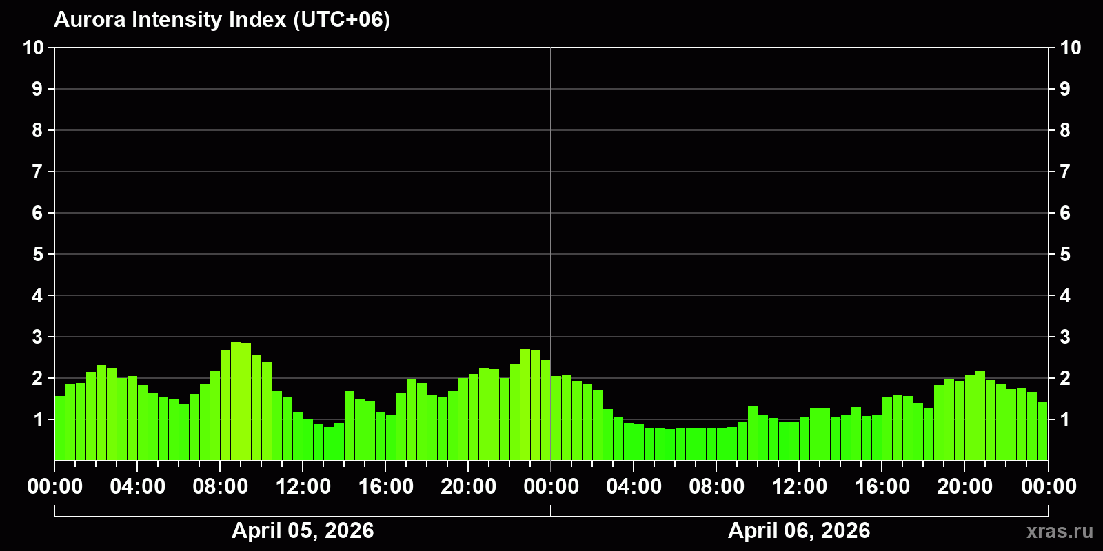 Changes in the auroral intensity index from 2026-04-05 to 2026-04-06 local time
