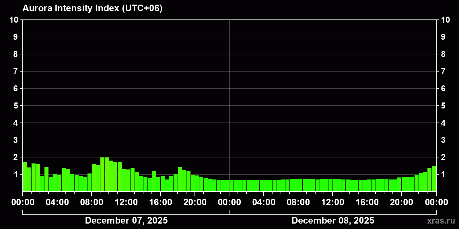 Changes in the auroral intensity index from 2025-12-07 to 2025-12-08 local time