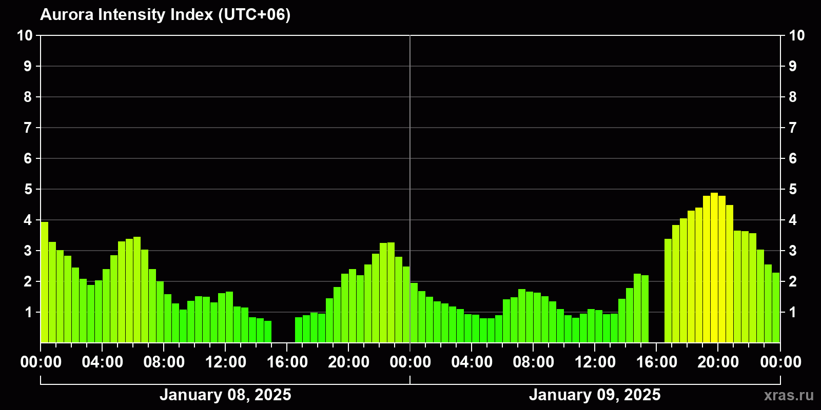 Auroral intensity index and the theoretically possible latitude of observations for nighttime in the Estern Hemisphere as of 2025-01-09 23:48 (end of day) local time