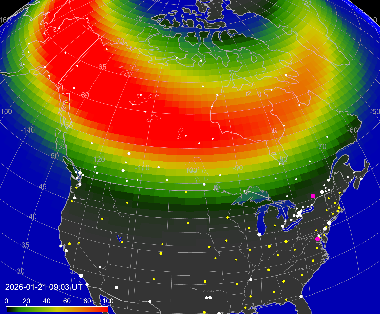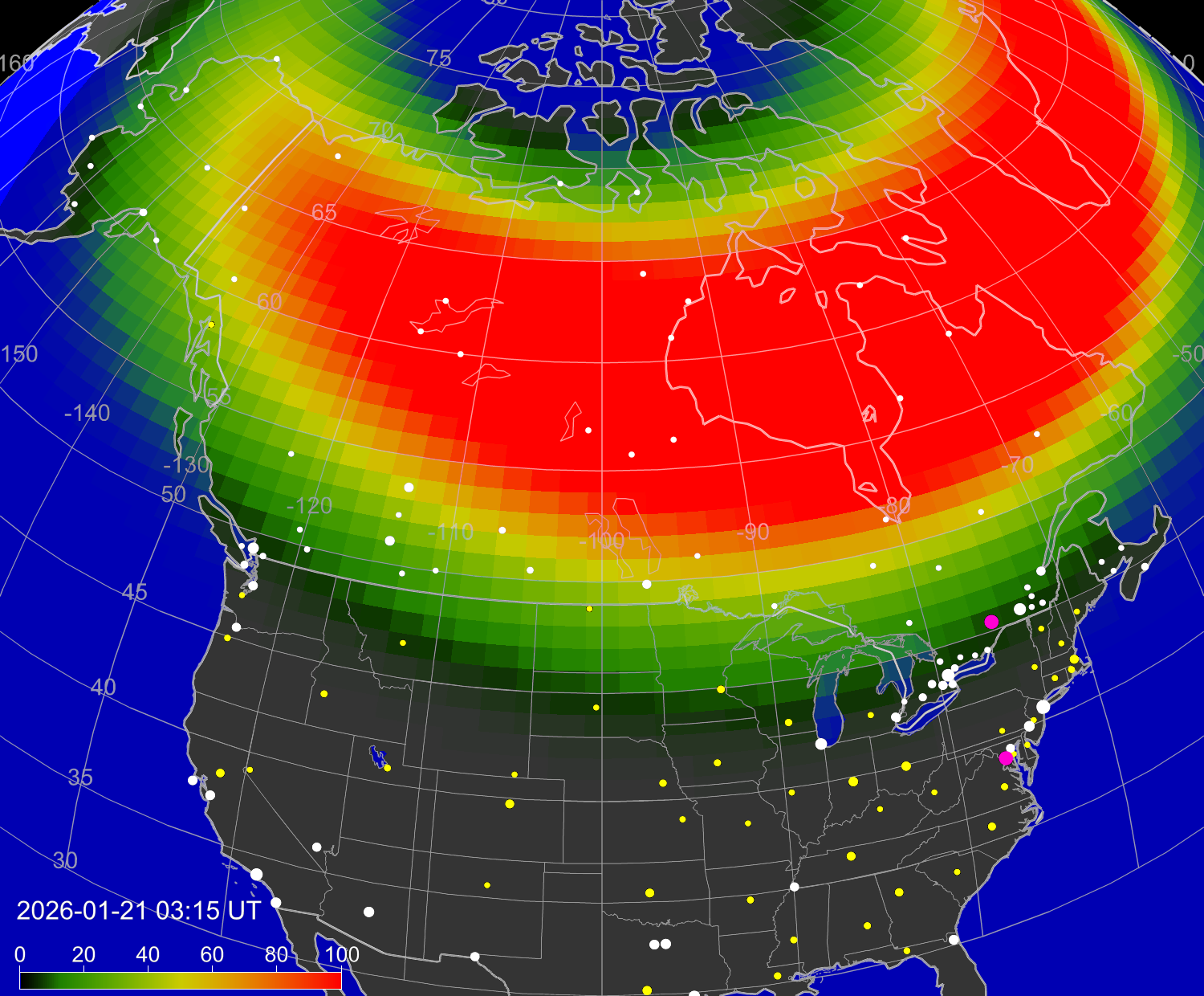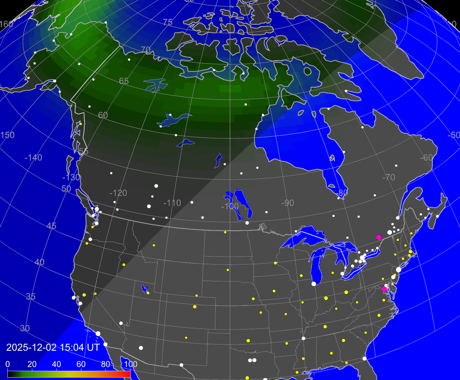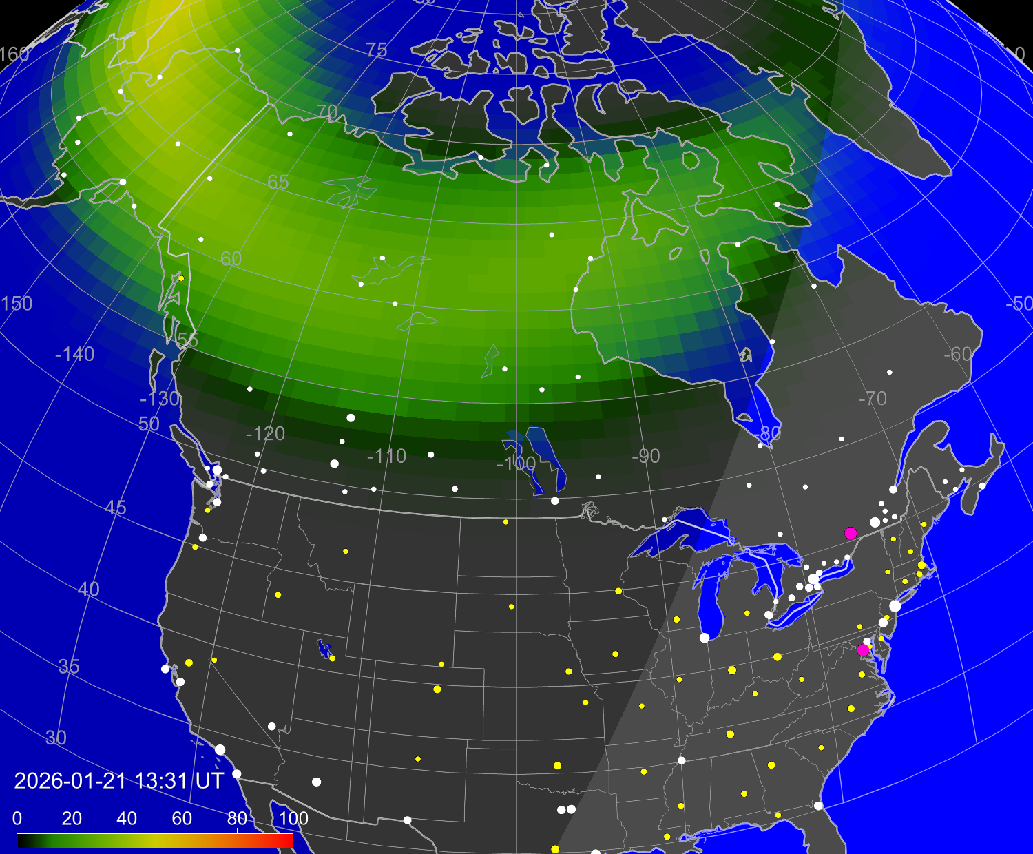 Вероятность полярных сияний в городах США