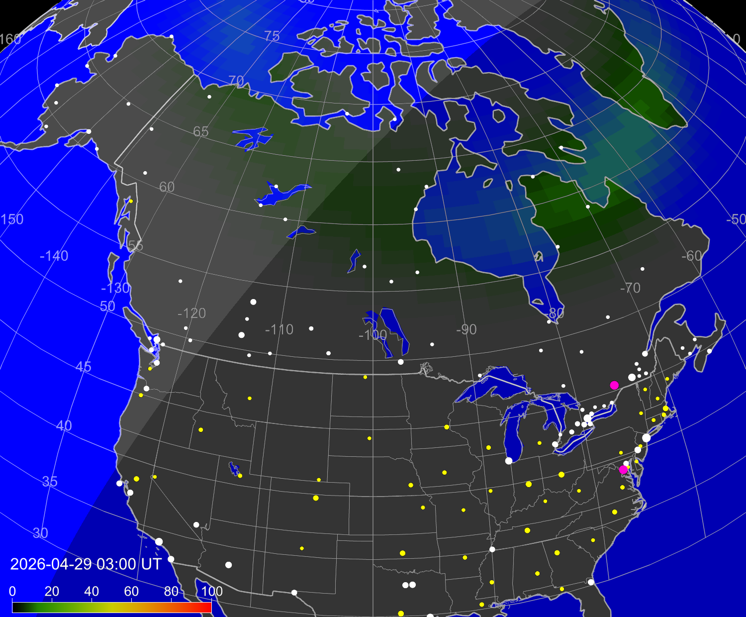 Auroral intensity index and theoretically possible latitude of observations for nighttime in the Western Hemisphere